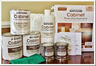 First project up was the counter tops. They used a Rustoleum Cabinet Transformations kit. It contains everything you need from deglosser (eliminates the need for sanding) to the top coat and everything in between