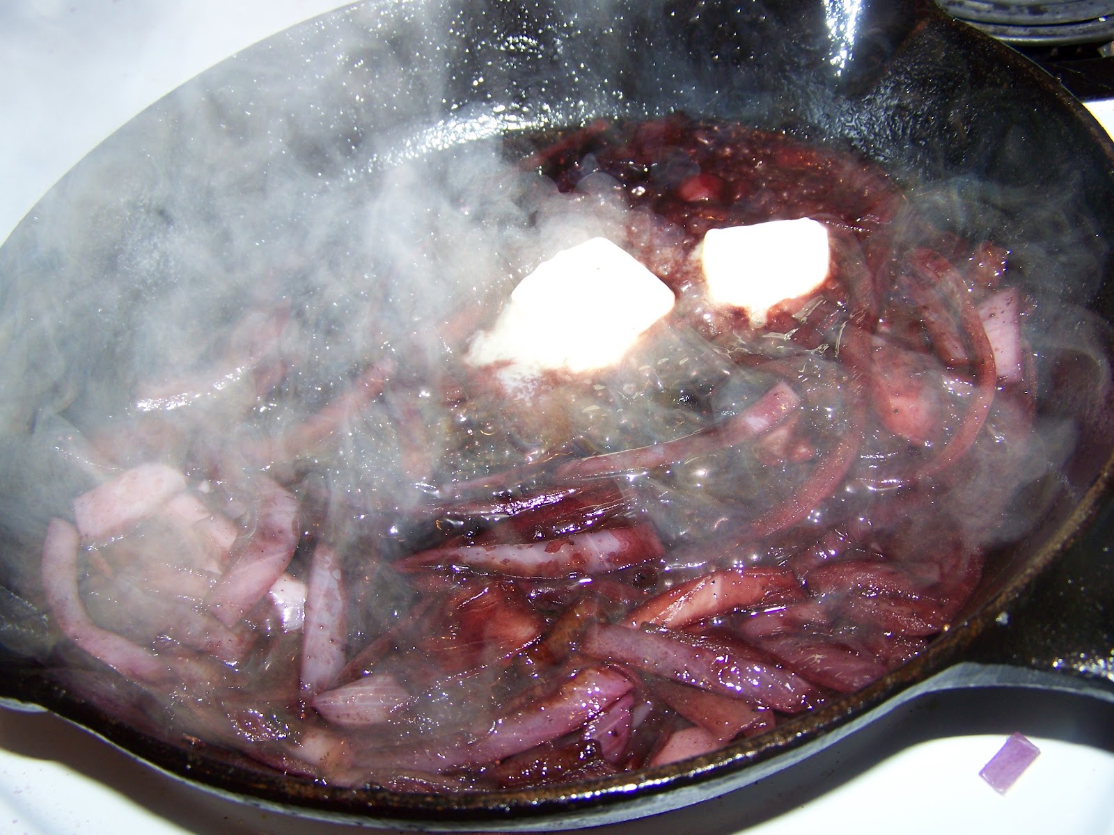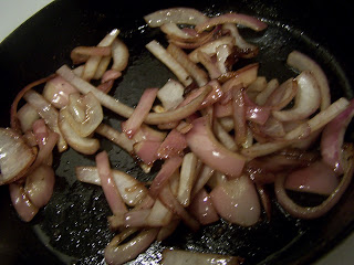 Begin by cooking your onions in a bit of butter or oil.  On this particular day the thought of walking outside and turning on the grill proved to be way more effort than I was willing to put in.  Sooo....I cooked my steak in a cast iron skillet.  I cooked my onions in the same skillet to pick up some of the yummies left in the pan.