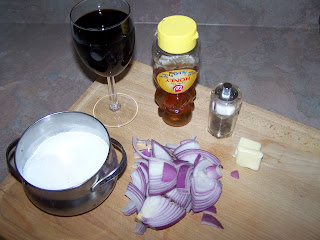 One large red onion sliced , a glass of red wine, the good ole honey bear, salt, pepper, and butter