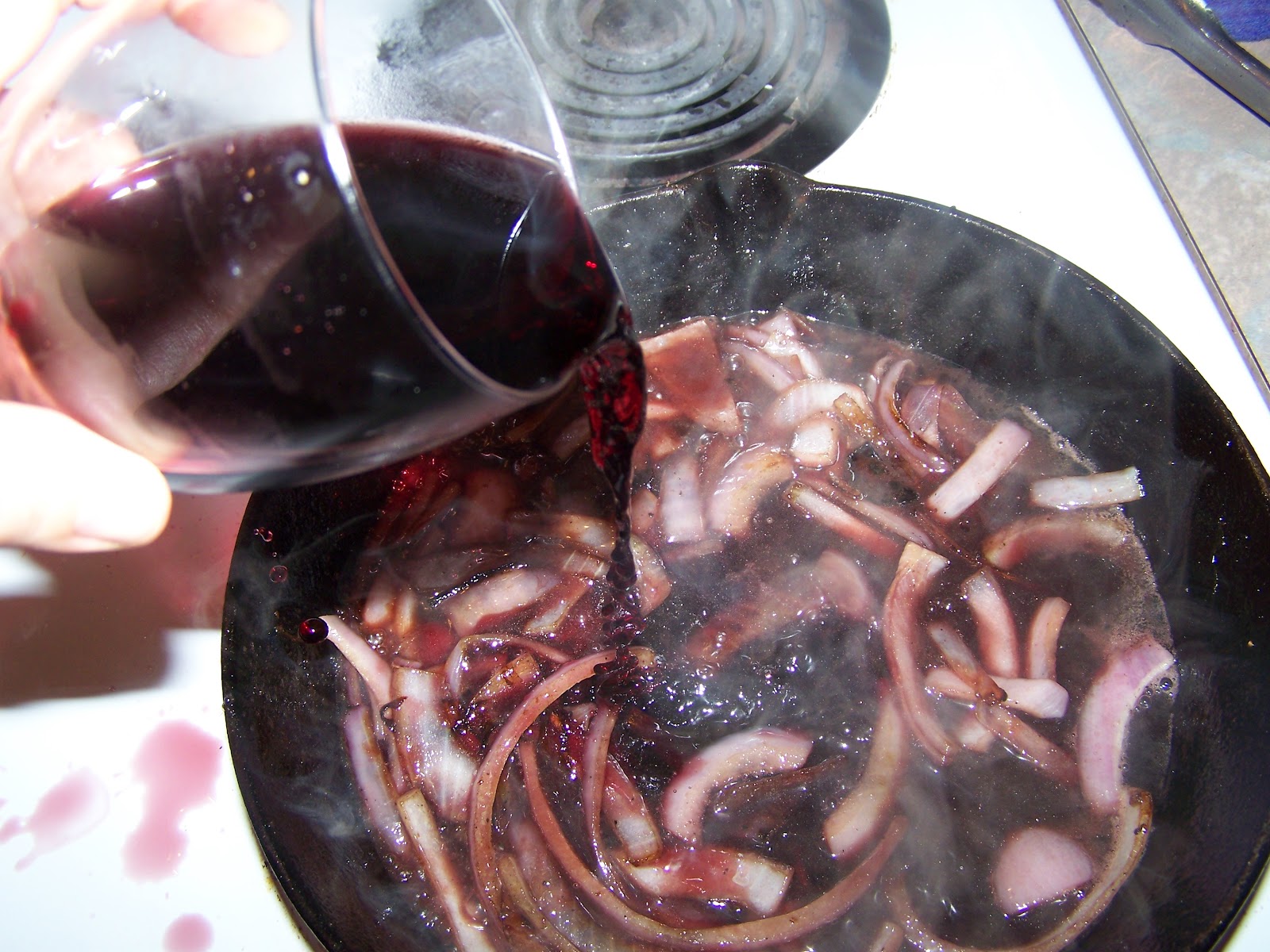 Give it some salt and pepper and then pour in your wine.  (like my wine dribble there on the stove?) Have your heat on medium high and just let it bubble.  Once the wine has reduce down to an almost syrupy consistency, mount it with some butter.  About 2 tablespoons.