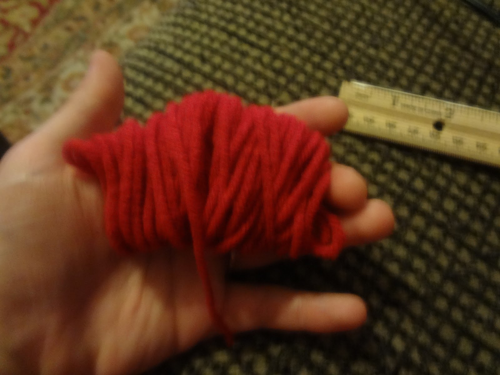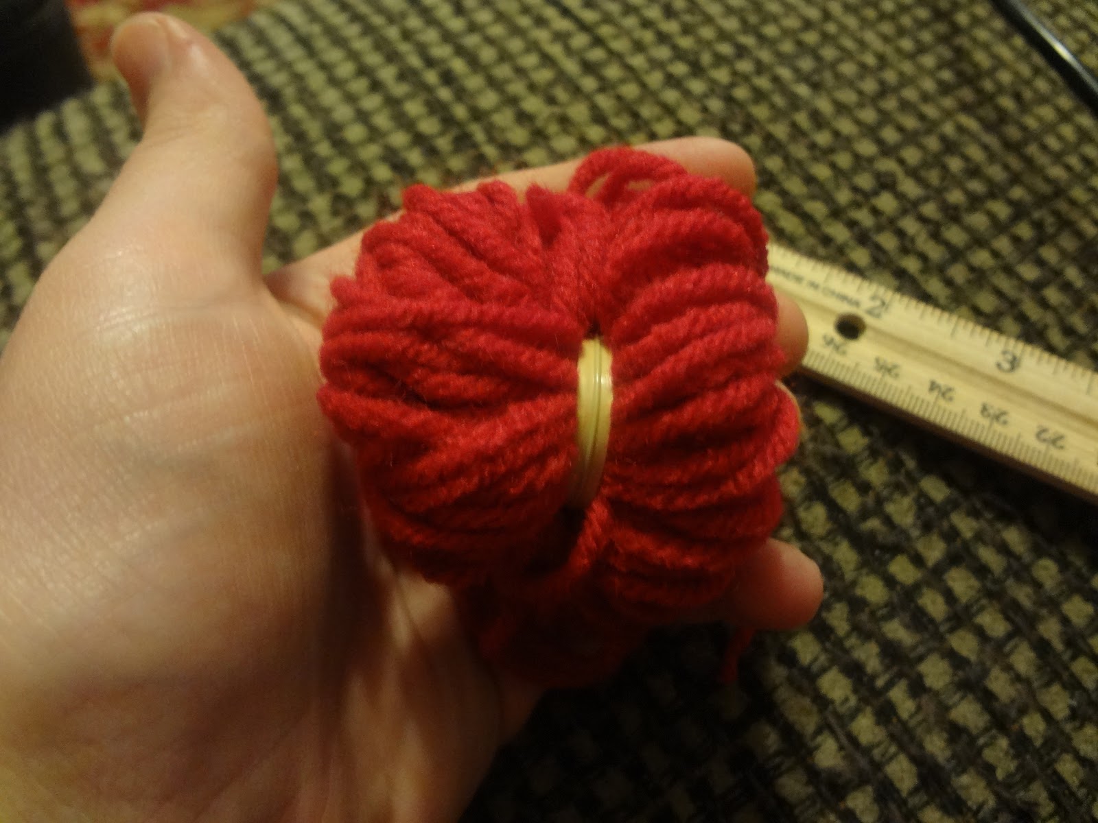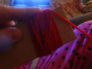 Take a 2 inch wide piece of cardboard and start wrapping around it with yarn until you have a pretty thick bundle. Just imagine in your head how big you want the pom pom to be and kind of guess
