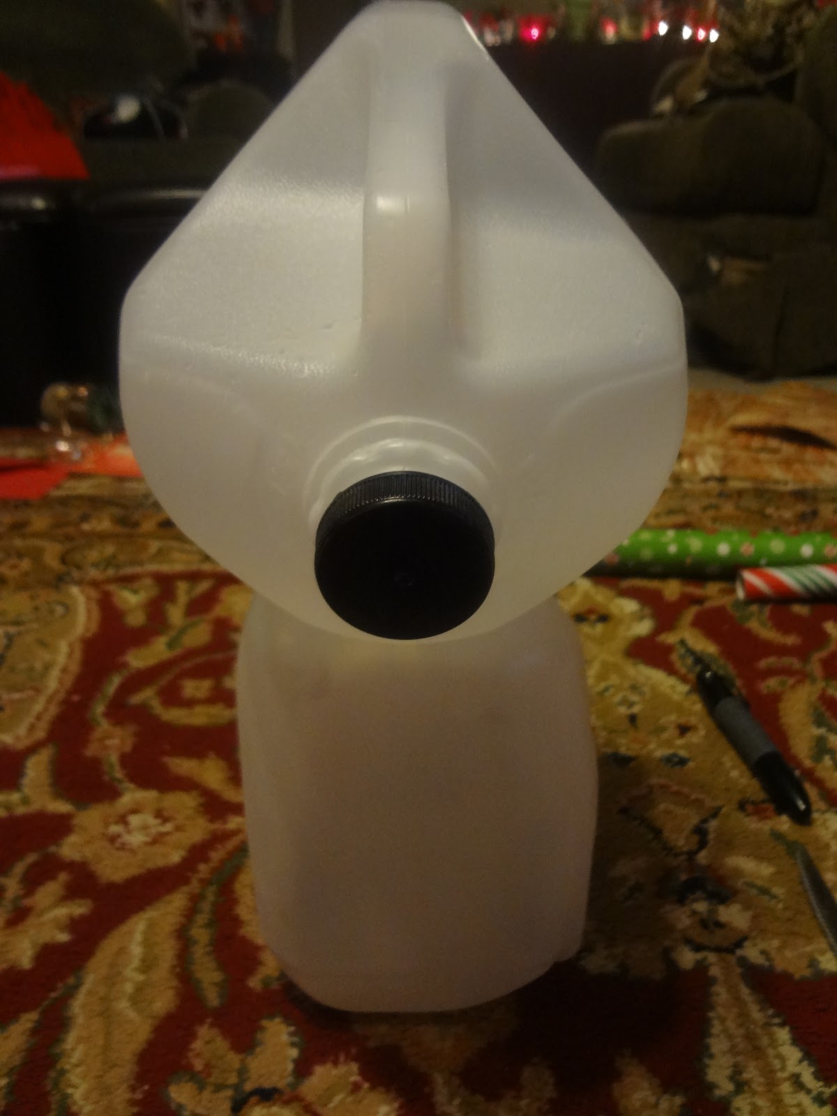 Cut the top off one jug and color the cap of the other with a black sharpie for his nose